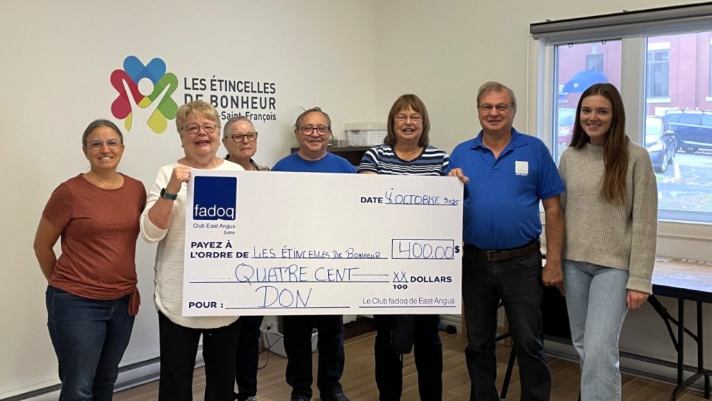 Le 8 octobre dernier, le Club de la Fédération de l’Âge d’Or du Québec (FADOQ) de East Angus a remis un don de 400 $ aux Étincelles de Bonheur du Haut-Saint-François dans les locaux de l’organisme, situé à East Angus.