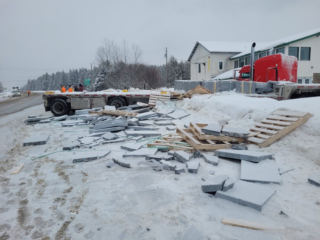 Le mardi 10 février dernier une collision est survenue sur la route 108 à Bury tout près de l’ancien bar situé à l’intersection de la route 214 (chemin Victoria, en direction de Scotstown.) En milieu de matinée, un camion semi-remorque à plateau (couramment appelé « flat bed ») en provenance de la Beauce est entré en collision avec une camionnette noire se dirigeant vers East Angus. L’impact a propulsé la camionnette dans le fossé inverse et projeté une partie du chargement du camion, en l’occurrence des dalles de ciment, sur la chaussée. Heureusement, aucun blessé n’est à déplorer.