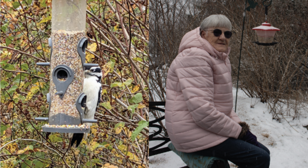 Vivre ses passions en vivant dans une résidence pour personnes aînées (RPA), c’est possible ? Certainement ! Ici au Manoir de l’eau vive, nous encourageons nos résidents.es à poursuivre les activités qu’ils aiment, en autant que nos installations le permettent. Mme Ruth Carette en est un bon exemple. Pour agrémenter ses journées, elle pratique l’observation des oiseaux. Elle a installé une grosse mangeoire dont elle s’occupe assidûment et avec soins. De plus en plus d’espèces d’oiseaux viennent la visiter ; des Tourterelles triste, des Jay bleus, des Cardinaux, des Mésanges, des Chardonnerets, des Pics Bois, des Bruants, des Juncos, une Sitelle et de temps en temps, des Gros Becs Errants (magnifiques oiseaux) viennent lui faire une visite surprise. Ceci ensoleille ses journées et celles des autres résidents.es. Nos employés.es en bénéficient aussi lors de leur pause. « Je me trouve très chanceuse de pouvoir vivre cette passion dans ma résidence. » nous confie madame Carette.